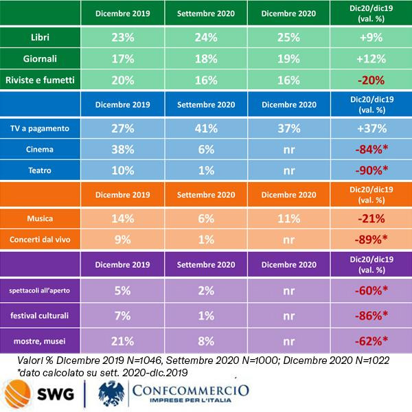 Tiene la lettura sia dei libri, con una preferenza per il cartaceo sebbene oltre italiano su tre utilizzi anche il formato digitale, che dei quotidiani, consultati principalmente in versione gratuita online e con un rapporto di circa 1 a 2 tra lettori in digitale a pagamento e lettori in cartaceo; in calo tutte le forme di abbonamento a servizi culturali a pagamento ad eccezione della TV in streaming (+17 punti su dicembre 2019) e con un terzo di italiani che pensa di utilizzare prevalentemente piattaforme streaming a pagamento a testimonianza di un crescente interesse per questo tipo di offerta televisiva rispetto a quella generalista; la forma di fruizione tradizionale della cultura ha lasciato spazio al digitale, come già evidenziato da una precedente ricerca Confcommercio–Swg con la visione di spettacoli dal vivo, opere, balletti e musica classica soprattutto sul web o in TV. Una tendenza che, alla luce delle attuali restrizioni, sembra confermarsi anche per la prima parte del 2021.